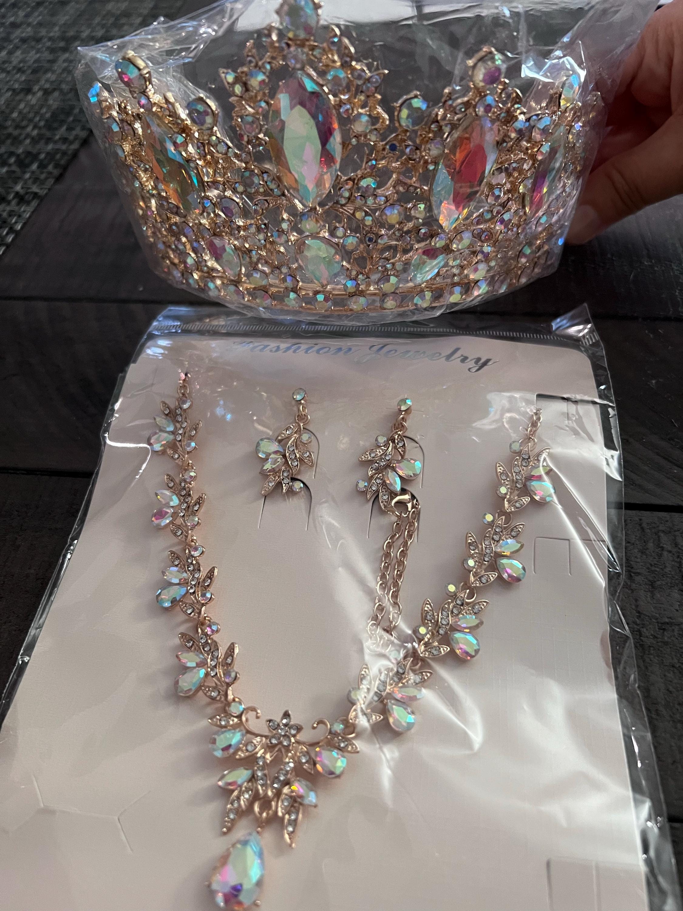 BePhora Iridescent NEW Gold AB Crystal Quinceanera Crown - Gold AB, Silver Quince Crown, Necklace, Earrings Wedding Headpiece Tiara Sweet 16
